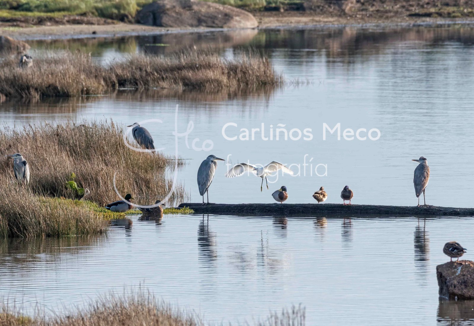 Fotografía de un humedal en el Espacio Intermareal Umia-O Grove, en Pontevedra, donde garzas y patos descansan sobre una pequeña isla durante la bajamar. La escena refleja la riqueza de la fauna y los paisajes naturales de Galicia, convirtiéndose en un entorno ideal para la fotografía de naturaleza.